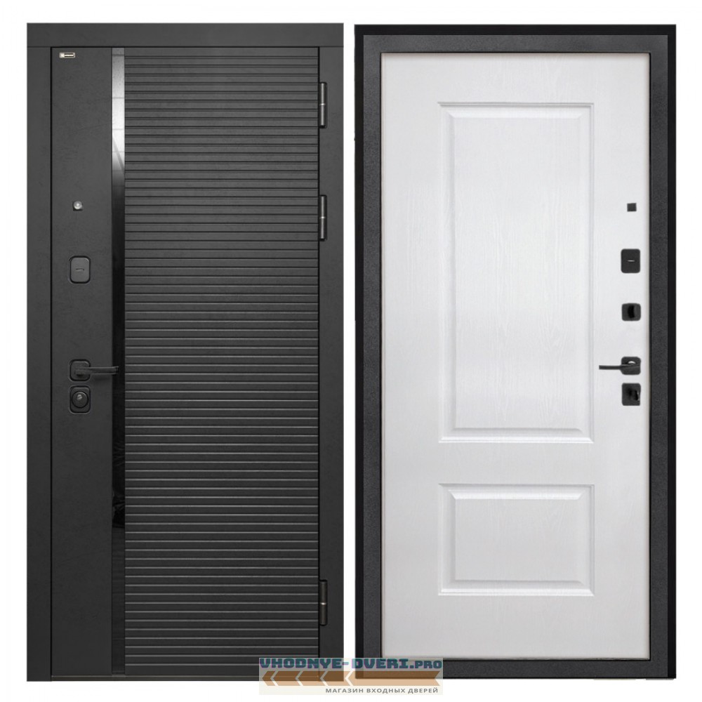 Отделка снаружи — панель МДФ 10 мм, ламин. фрез. мат, цвет «Лофт черный», МДФ наличник прямой, вставка из СТЕКЛА «лакобель черная»