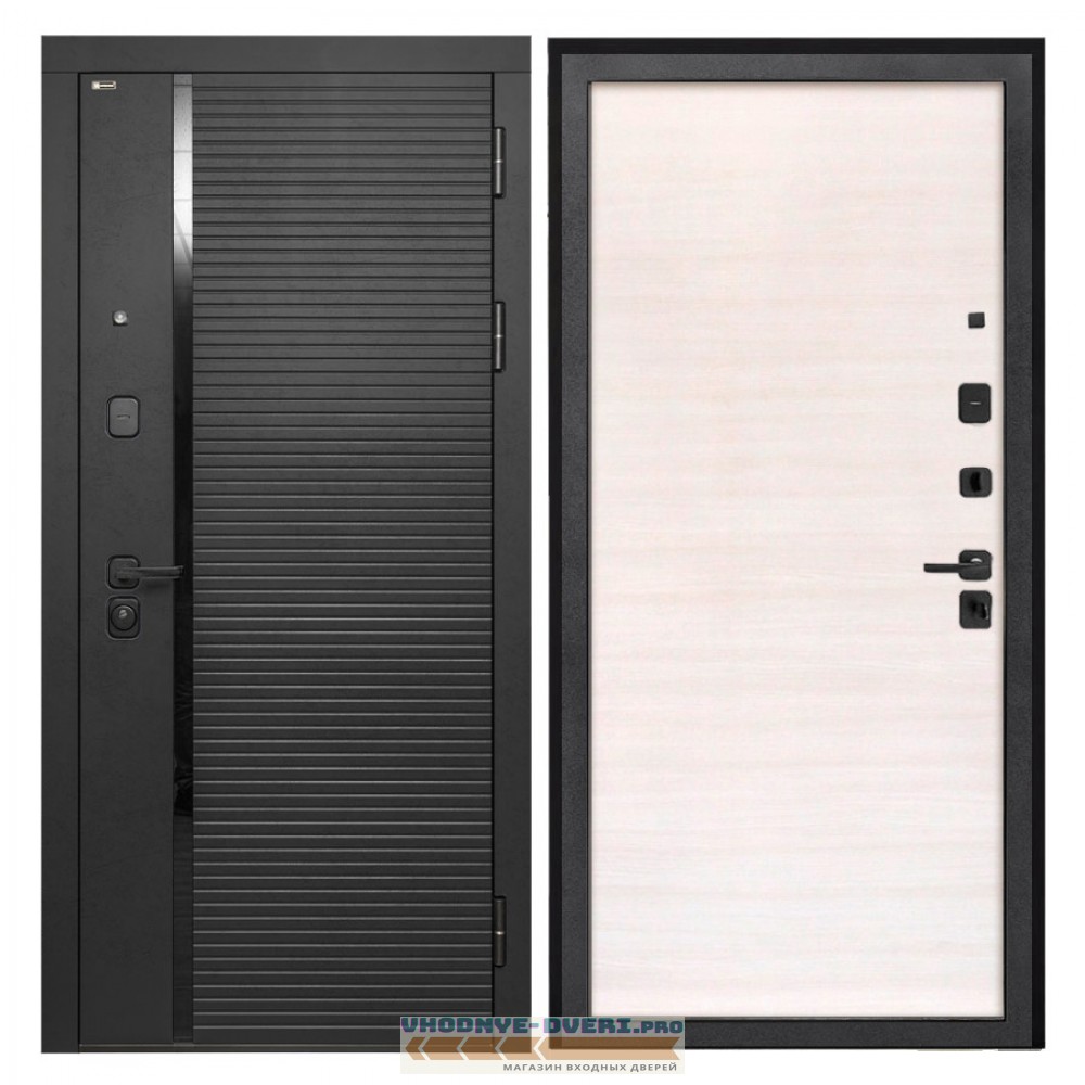 Отделка снаружи — панель МДФ 10 мм, ламин. фрез. мат, цвет «Лофт черный», МДФ наличник прямой, вставка из СТЕКЛА «лакобель черная»