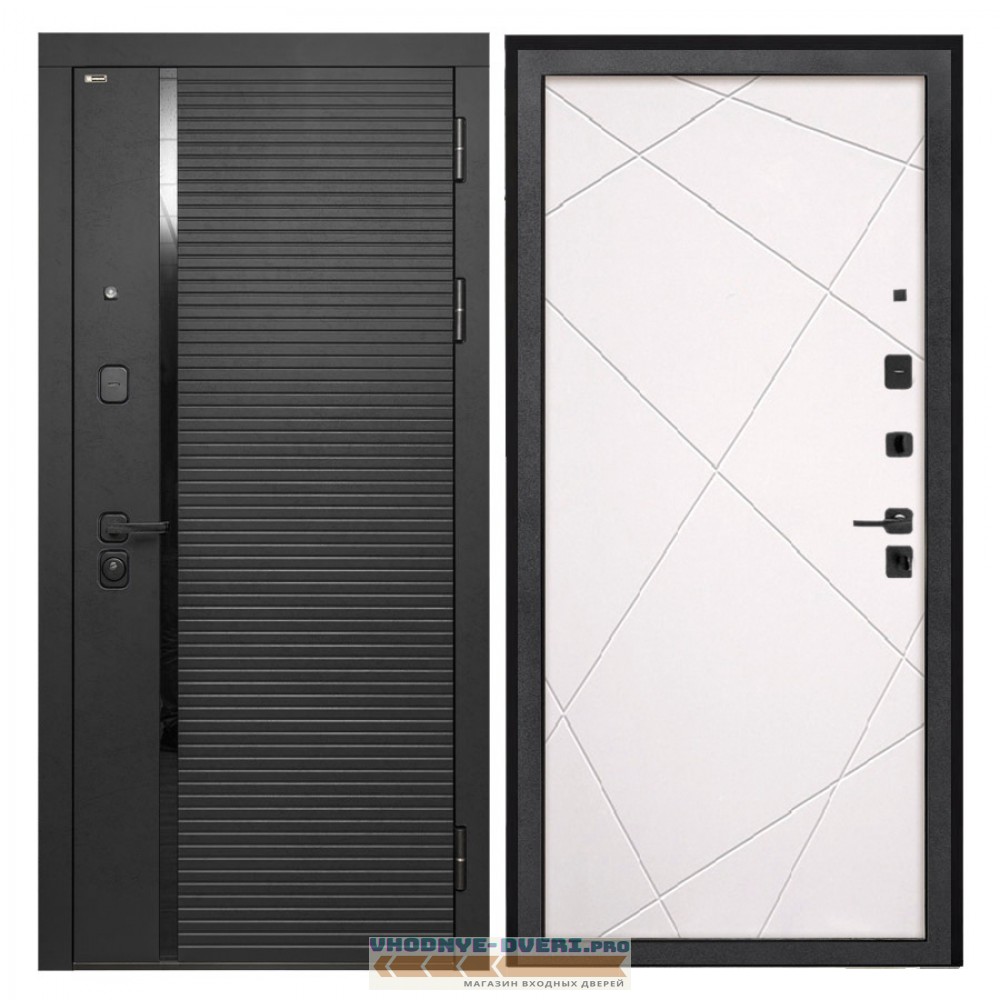 Отделка снаружи — панель МДФ 10 мм, ламин. фрез. мат, цвет «Лофт черный», МДФ наличник прямой, вставка из СТЕКЛА «лакобель черная»