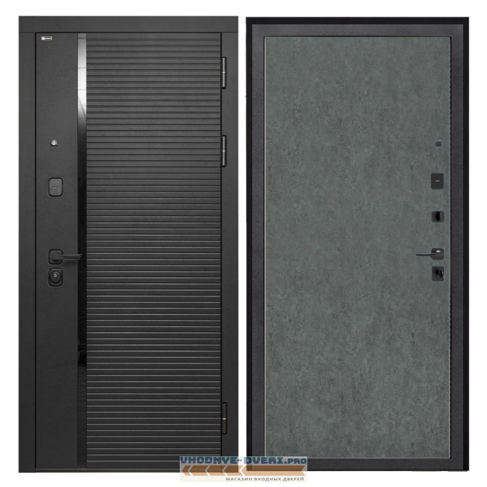 Отделка снаружи — панель МДФ 10 мм, ламин. фрез. мат, цвет «Лофт черный», МДФ наличник прямой, вставка из СТЕКЛА «лакобель черная»