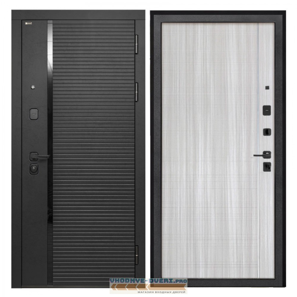 Отделка снаружи — панель МДФ 10 мм, ламин. фрез. мат, цвет «Лофт черный», МДФ наличник прямой, вставка из СТЕКЛА «лакобель черная»