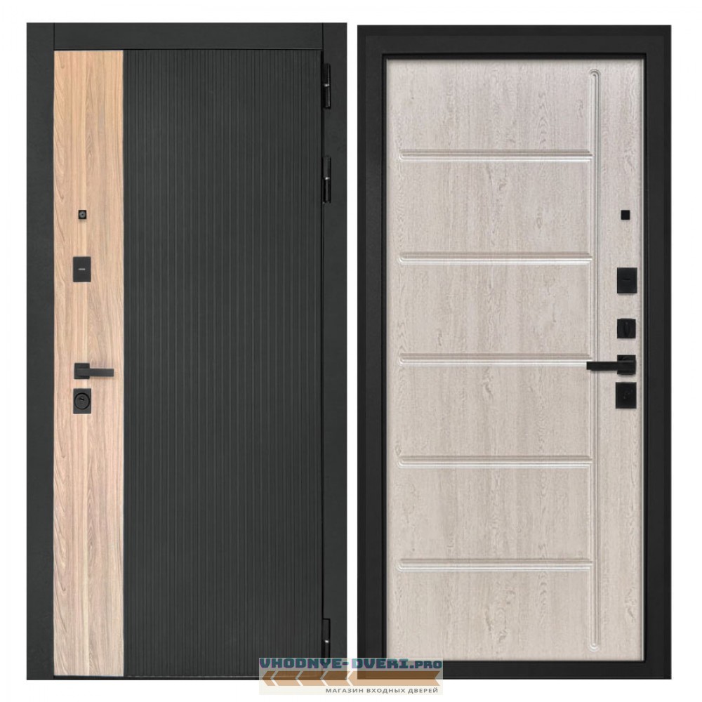 Отделка снаружи — панель МДФ 16 мм, пленка цвет «Лофт черный» + вставка «Ильм американский» МДФ наличники