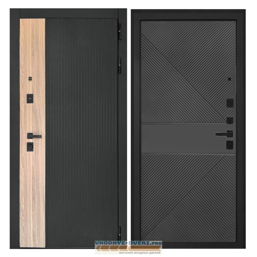Отделка снаружи — панель МДФ 16 мм, пленка цвет «Лофт черный» + вставка «Ильм американский» МДФ наличники