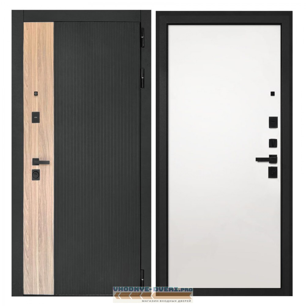 Отделка снаружи — панель МДФ 16 мм, пленка цвет «Лофт черный» + вставка «Ильм американский» МДФ наличники
