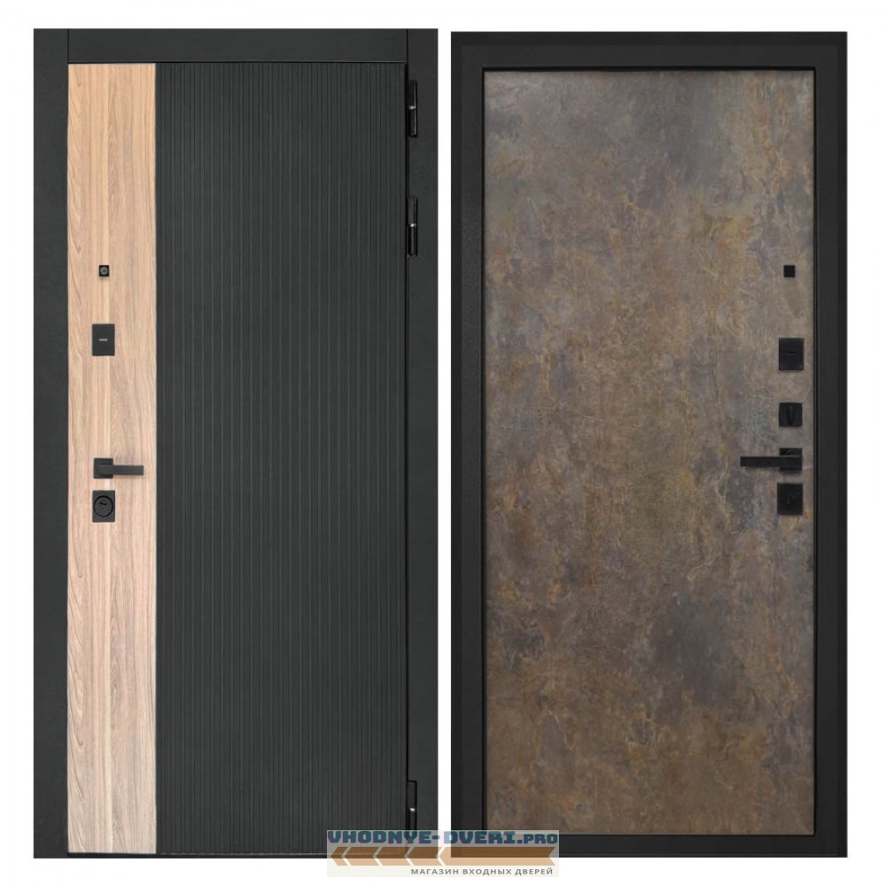 Отделка снаружи — панель МДФ 16 мм, пленка цвет «Лофт черный» + вставка «Ильм американский» МДФ наличники