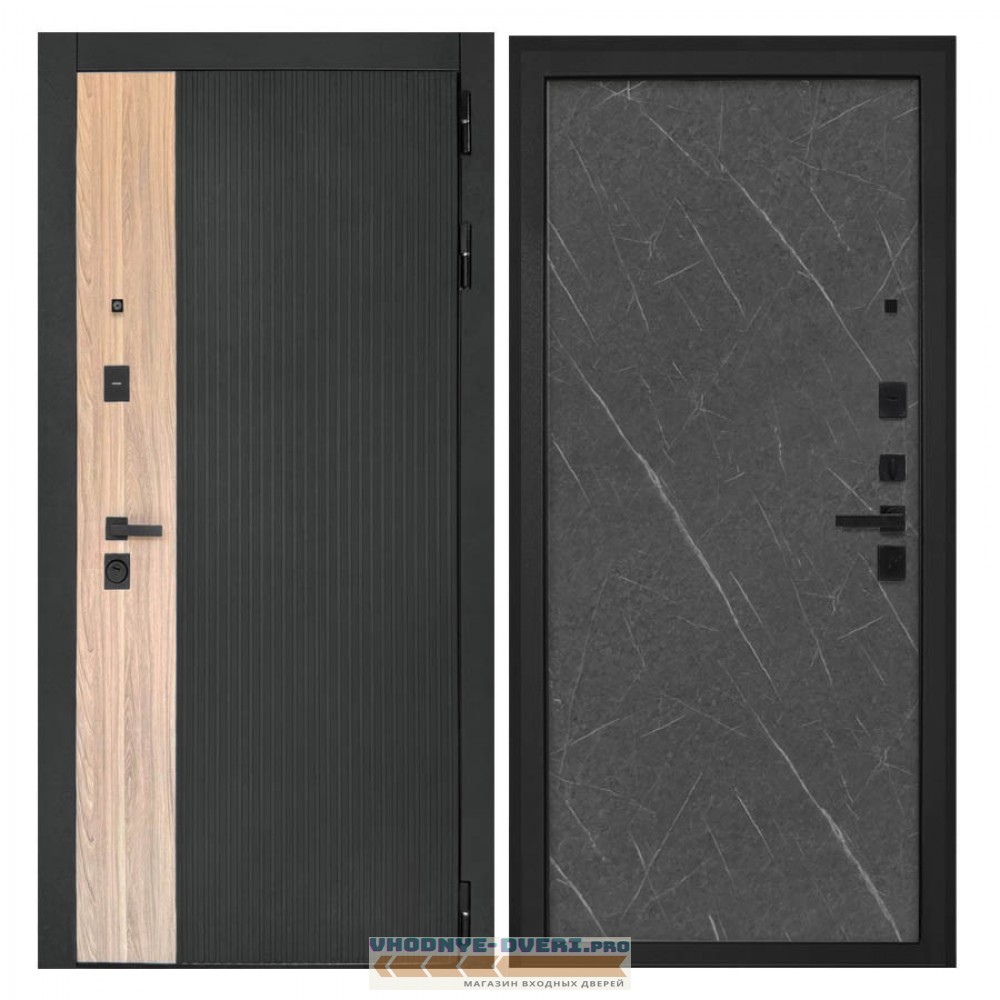 Отделка снаружи — панель МДФ 16 мм, пленка цвет «Лофт черный» + вставка «Ильм американский» МДФ наличники