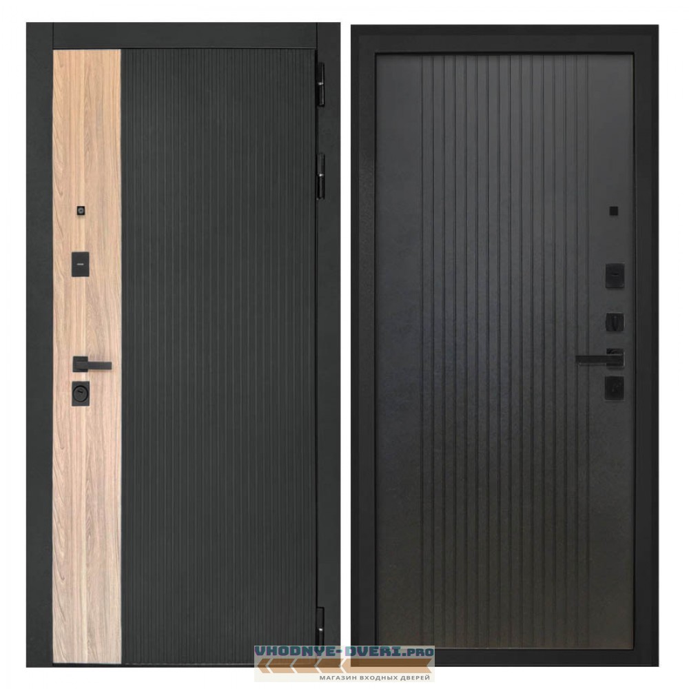 Отделка снаружи — панель МДФ 16 мм, пленка цвет «Лофт черный» + вставка «Ильм американский» МДФ наличники