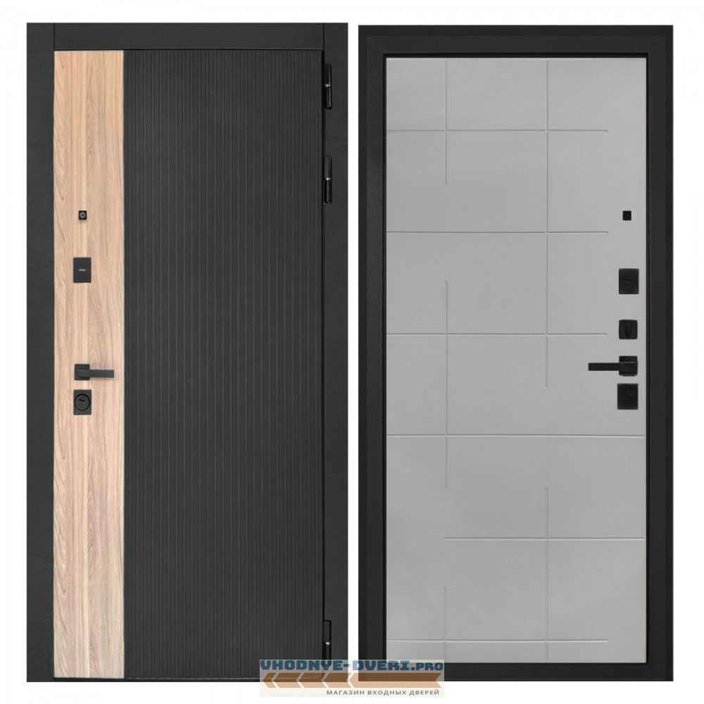 Отделка снаружи — панель МДФ 16 мм, пленка цвет «Лофт черный» + вставка «Ильм американский» МДФ наличники