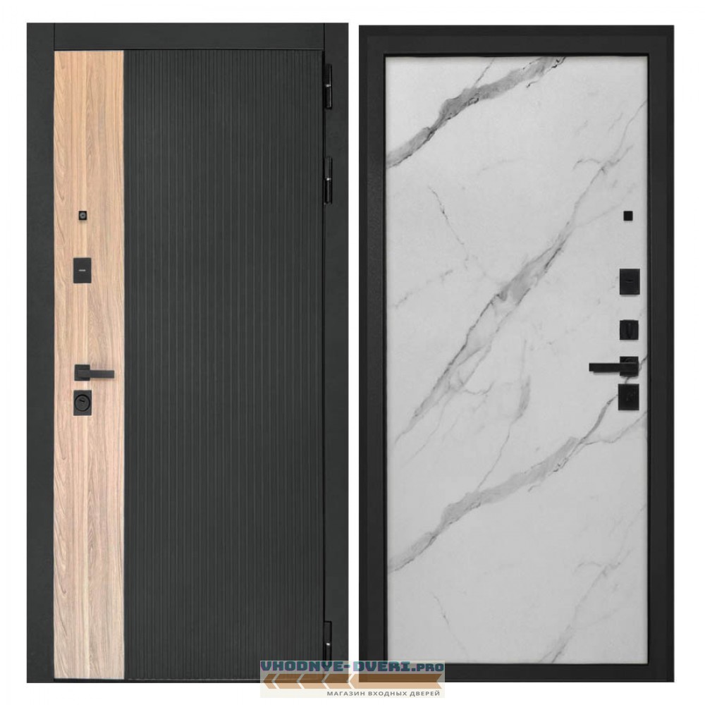 Отделка снаружи — панель МДФ 16 мм, пленка цвет «Лофт черный» + вставка «Ильм американский» МДФ наличники