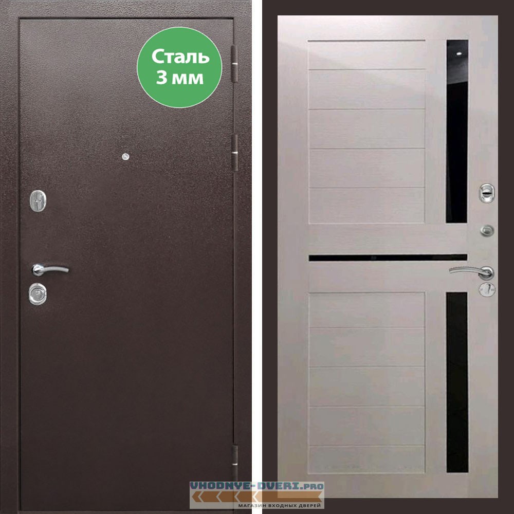 Входная дверь REX (Рекс) 5 металл 3мм медный антик сб-18 лиственница бежевая черное стекло